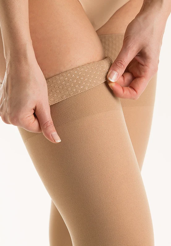 Θεραπευτικές κάλτσες ριζομηρίου διαβαθμισμένης συμπίεσης Relaxsan Medicale, με υποαλλεργική σιλικόνη στον μηρό και με ενίσχυση στη φτέρνα και τα δάκτυλα. Υψηλής ποιότητας κατασκευή και τελειώματα για μέγιστη άνεση. Η αναφερόμενη συμπίεση αφορά τον αστράγαλο και μειώνεται σταδιακά προς τα πάνω και ειδικότερα ασκείται το 70% της συμπίεσης στην γάμπα και το 40% στον μηρό, εξασφαλίζοντας την σωστή και καλή κυκλοφορία του αίματος. Κατασκευάζονται στην Ιταλία. Οι θεραπευτικές κάλτσες, συνήθως συνταγογραφούνται απο ειδικούς γιατρούς οι οποίοι, σύμφωνα με τα ποικίλα νοσήματα που χρήζουν αντιμετώπισης, συστήνουν το κατάλληλο προϊόν και το σωστό βαθμό συμπίεσης.